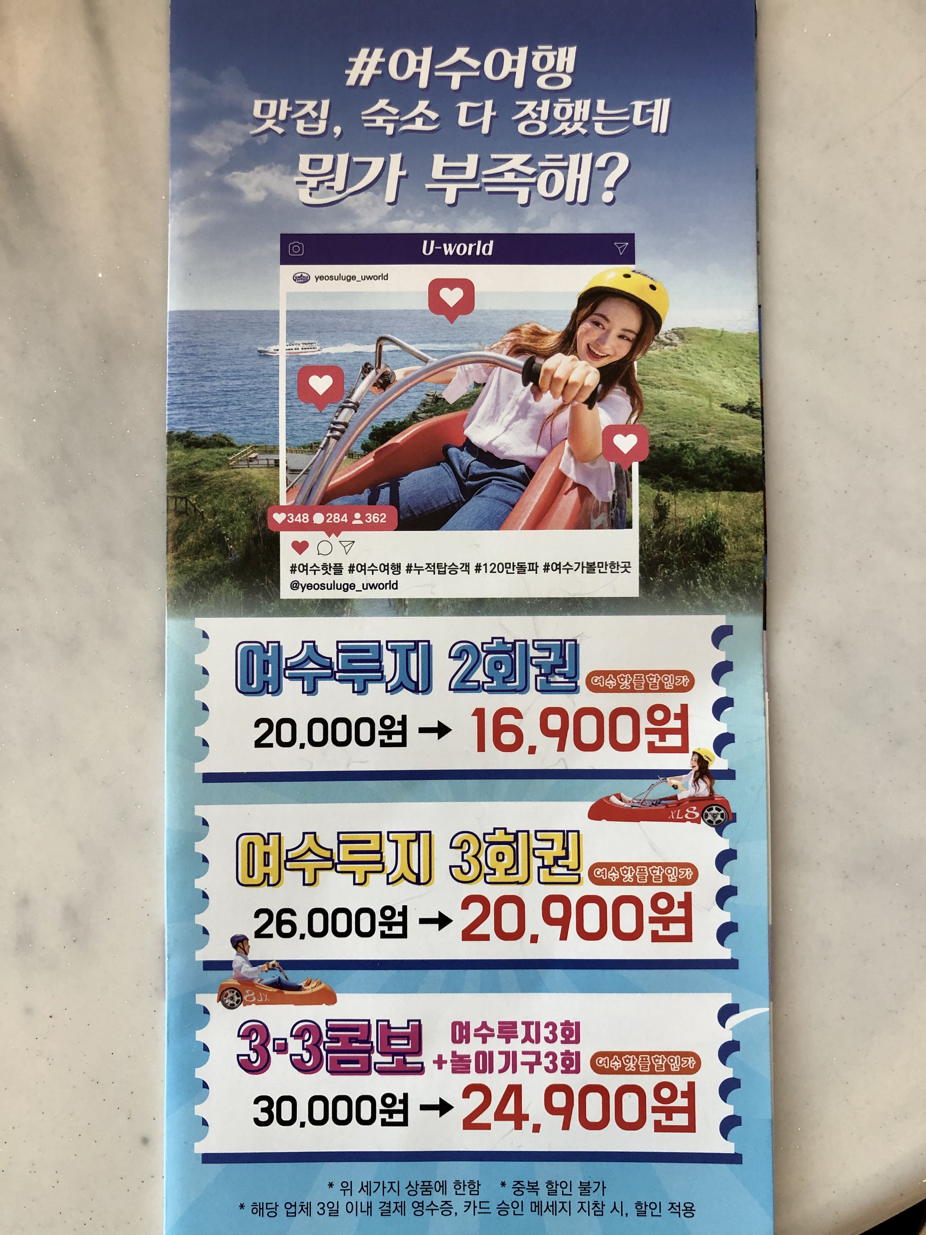 여수 갤러리안 카페에서는 루지와 놀이기구 콤보등 액티비티 할인권을 나눠주고 있습니다.