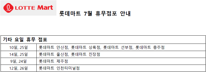 대부분의 롯데마트 점포는 2,4째주 일요일인 7월 11일과 7월 25일에 휴무합니다.