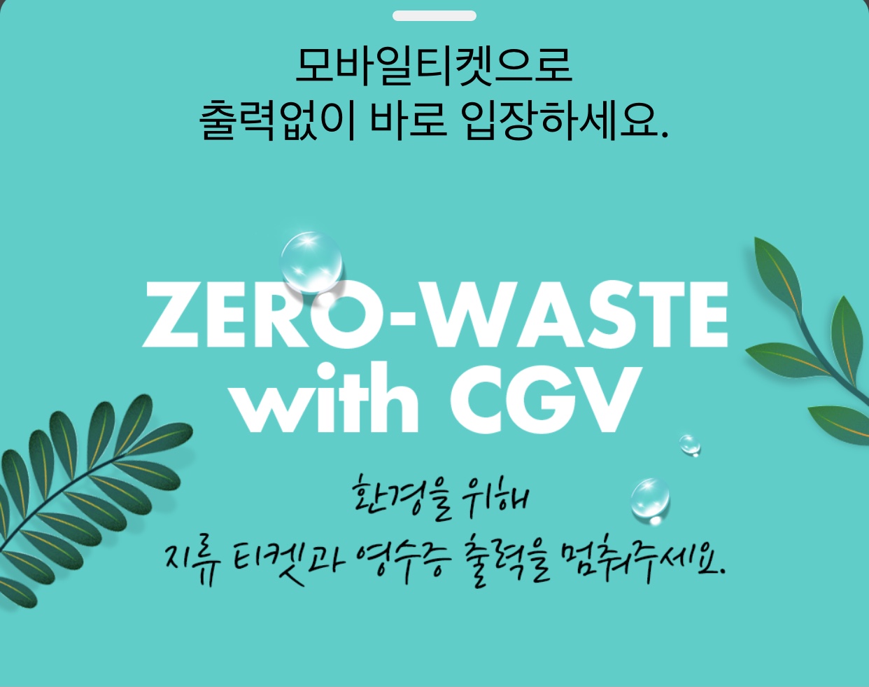 요즘 CGV에서는 ZERO-WASTE with CGV 라는 캠페인으로 지류티켓 없이 모바일로 입장이 가능해서