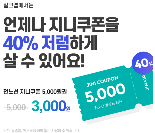 2) 진에어 회원이라면 누구나 밀크앱에서 40% 할인된 가격으로 지니쿠폰 5천원권을 밀크코인으로 구매 가능