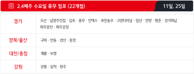 두번째로 2,4째주 수요일인 8월 11일과 8월 25일에도 22개의 홈플러스점포가 휴무하게 됩니다.