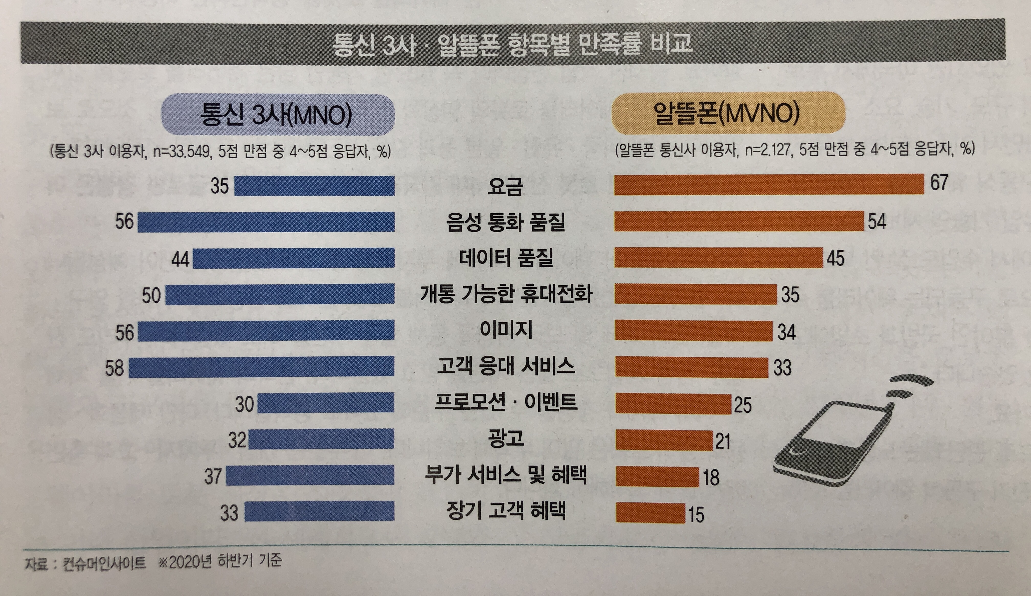만족률 비교표에서도 이는 여실히 드러나는데, 알뜰폰 사용 요금에 대한 만족도가 가장 높고