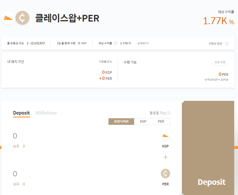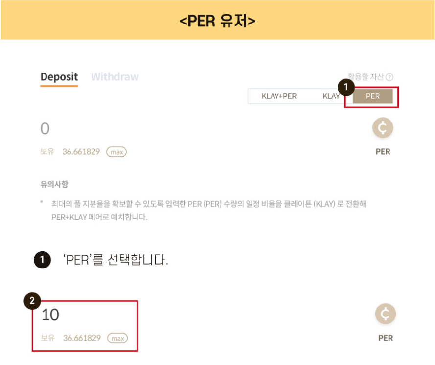 KLAY-PER 화면으로 예를 들면, 해당 풀에 들어가서 예치 자산으로 PER코인을 선택 후