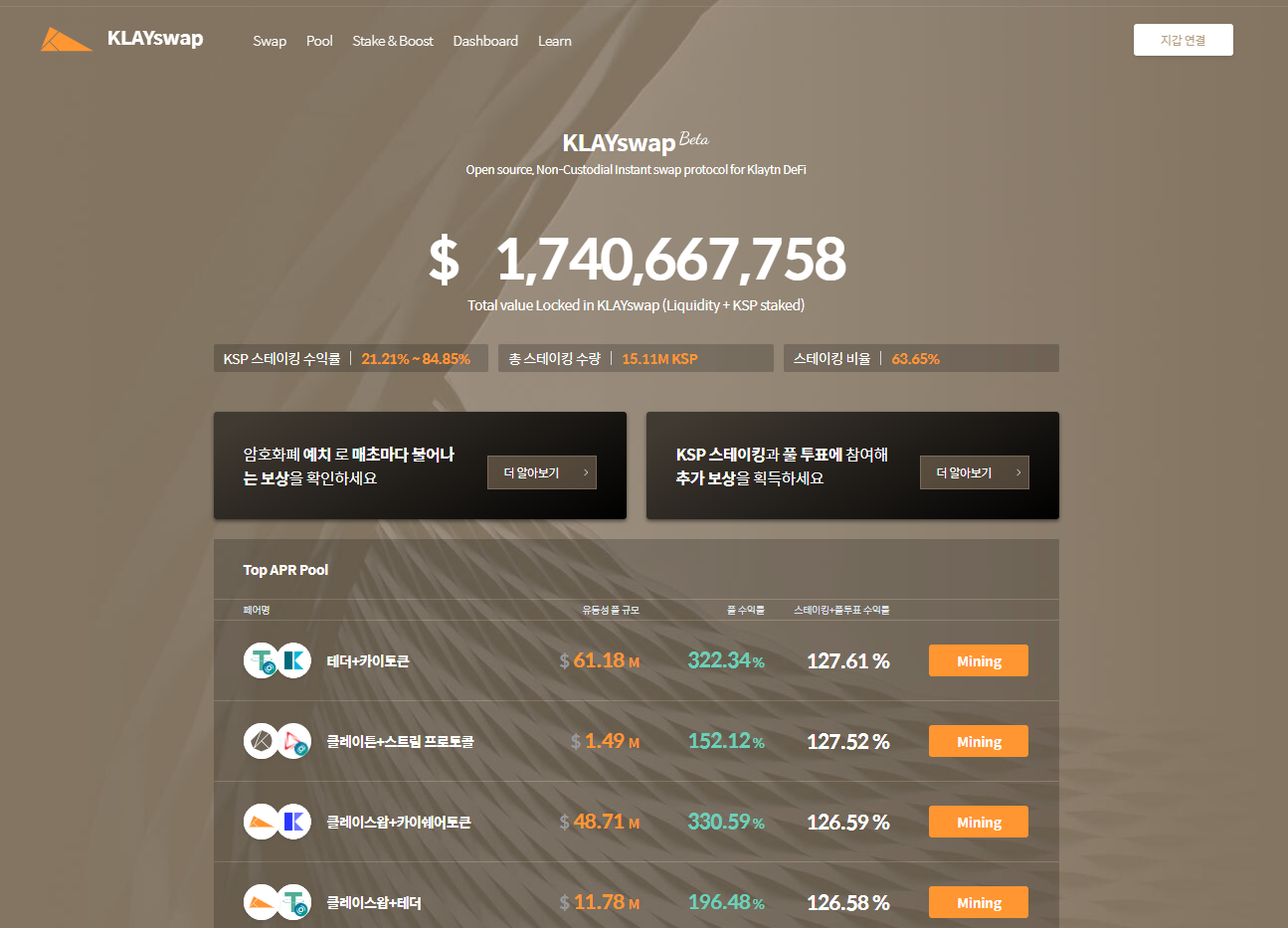 유동성 공급자는 KSP 분배 수익률과, 거래 수수료 분배 수익률, 스테이킹 보상 수익률까지 얻을 수 있습니다.