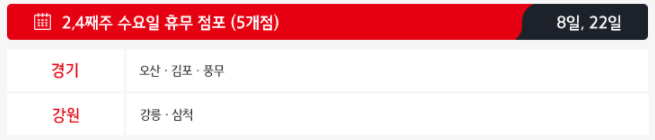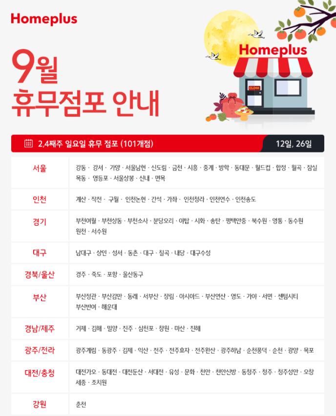 두번째로 2,4째주 수요일인 9월 8일과 9월 22일에도 5개의 홈플러스점포가 휴무하게 됩니다.