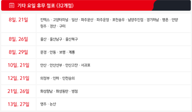 9월 8일과 9월 21일 휴무 홈플러스 점포로는 킨텍스, 고양터미널, 일산, 파주문산, 포천송우, 남양주진접,