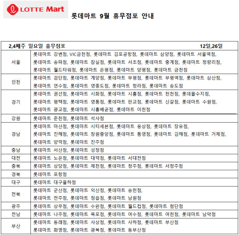 대부분의 롯데마트 점포는 2,4째주 일요일인 9월 12일과 9월 26일에 휴무합니다.