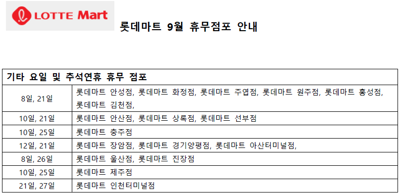 오늘은 9월 롯데마트 휴무일에 대해서 알아보았습니다.