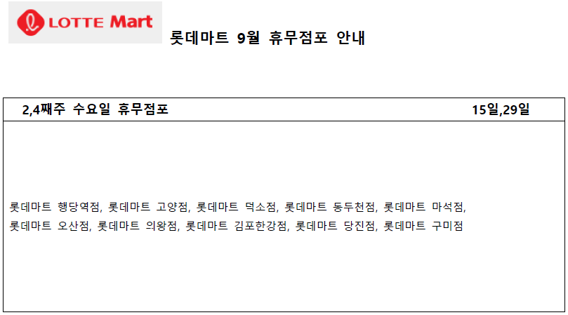두번째로 휴무일이 많은 2,4째주 수요일인 9월 15일과 9월 29일에도 많은 롯데마트가 휴무하게 됩니다.