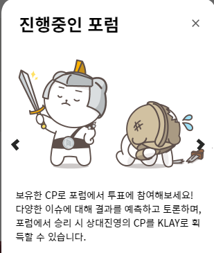 결과를 예측하고 토론하며, 포럼에서 승리 시 상대진영의 CP를 KLAY나 CP로 획득할 수 있는