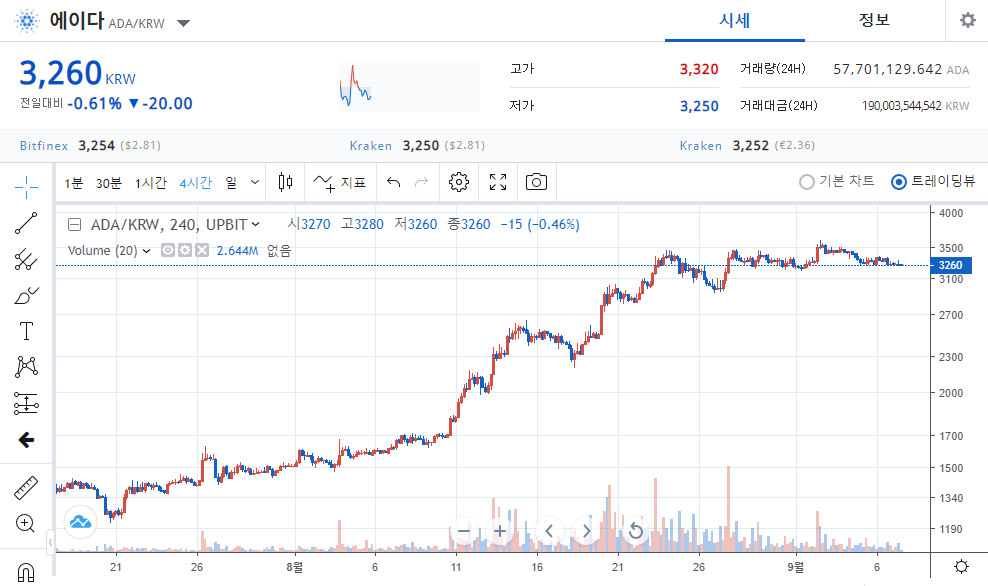 에이다 코인은 이러한 밝은 전망속에 최근 7월말 1000원 초반대에서 현재 3260원선에 기록되며