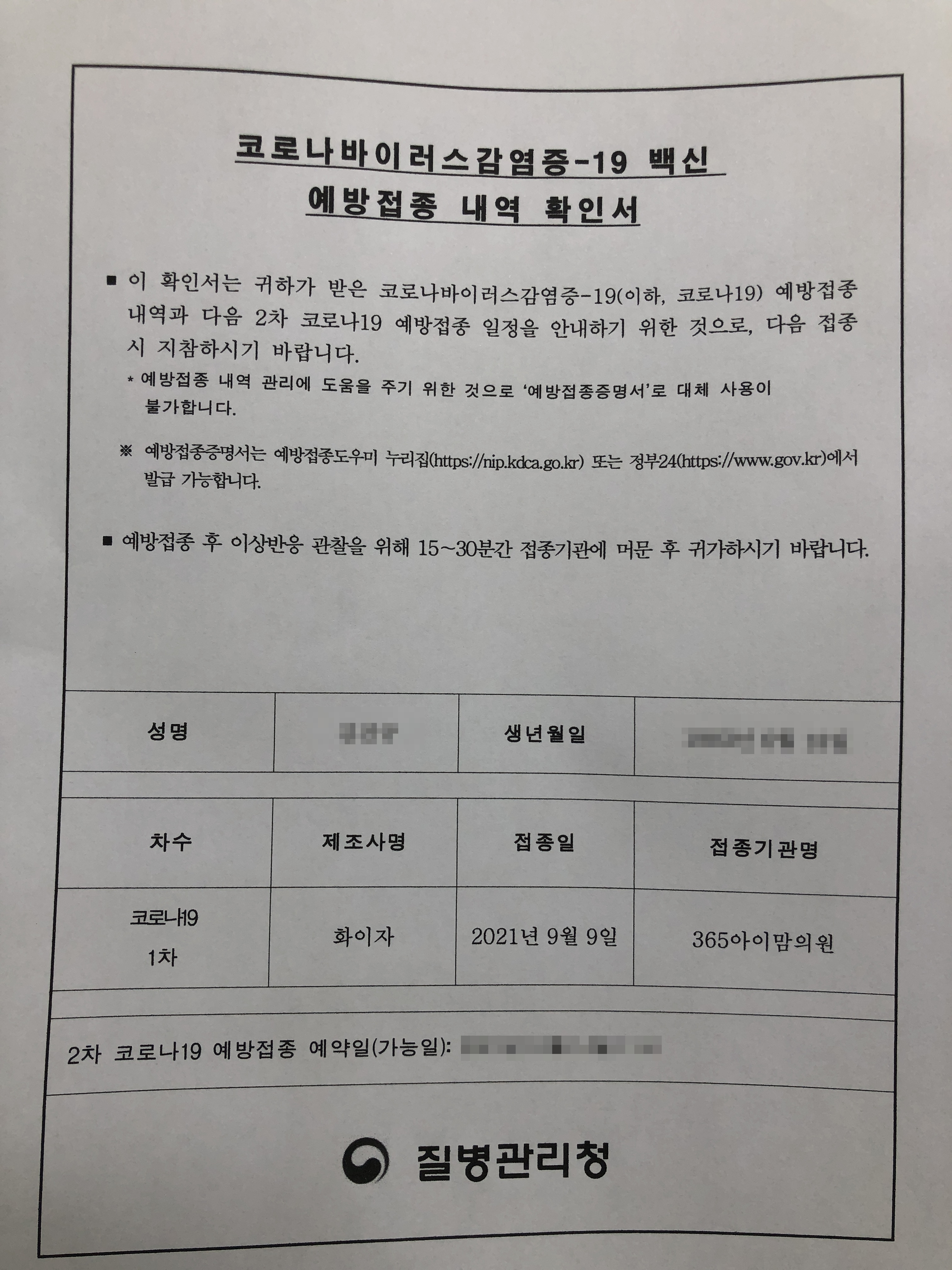 그리고 진료실에서 화이자 백신으로 1차 접종을 완료하였습니다.