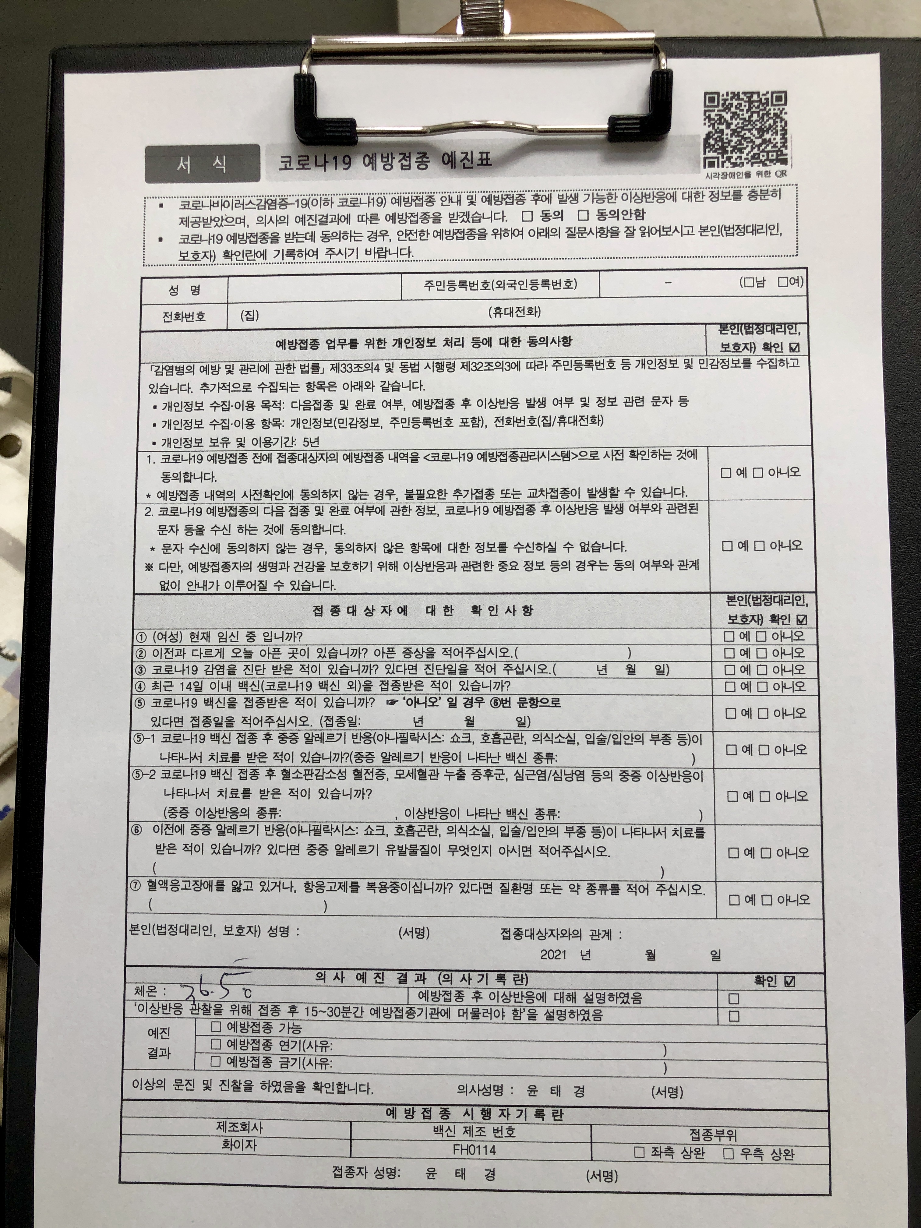 병원으로 들어서면서 코로나 19 예방접종 예진표를 작성하게 되는데요