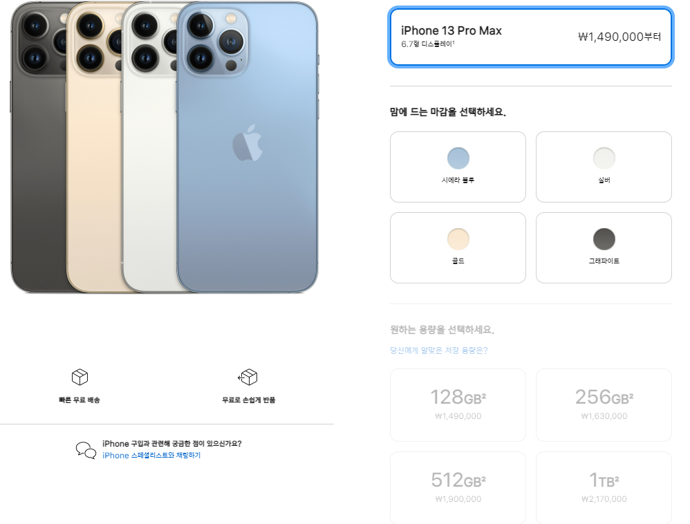 아이폰 13 프로 256기가는 149만원, 아이폰 13 프로 512기가는 176만원에 판매됩니다.
