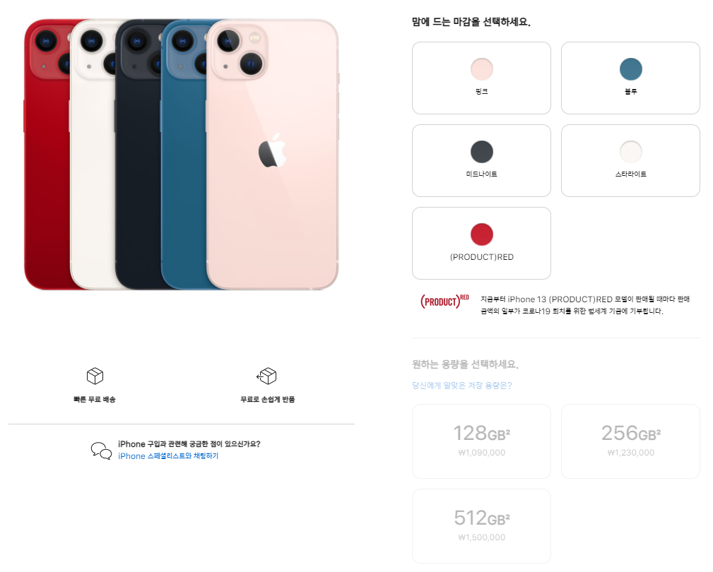 아이폰 13 128 기가 용량 가격은 기본인 109만원입니다.