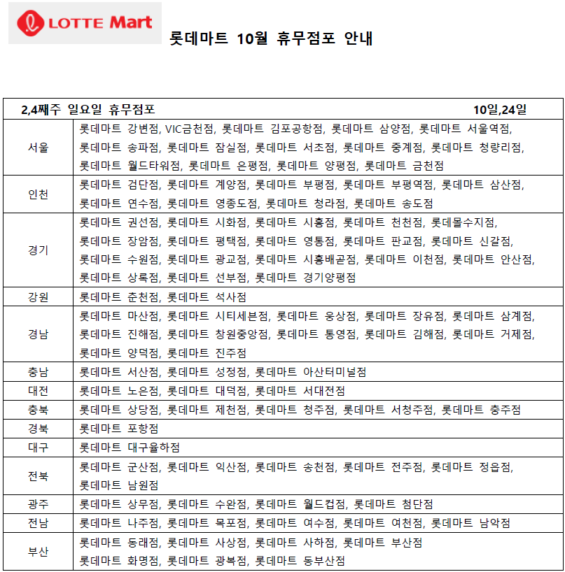 대부분의 롯데마트 점포는 2,4째주 일요일인 10월 10일과 10월 24일에 휴무합니다.