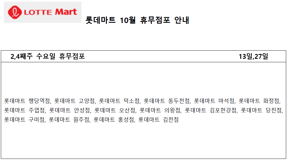 두번째로 휴무일이 많은 2,4째주 수요일인 10월 13일과 10월 27일에도 많은 롯데마트가 휴무하게 됩니다.