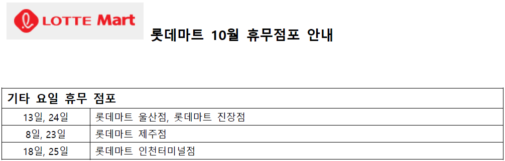 오늘은 10월 롯데마트 휴무일에 대해서 알아보았습니다.