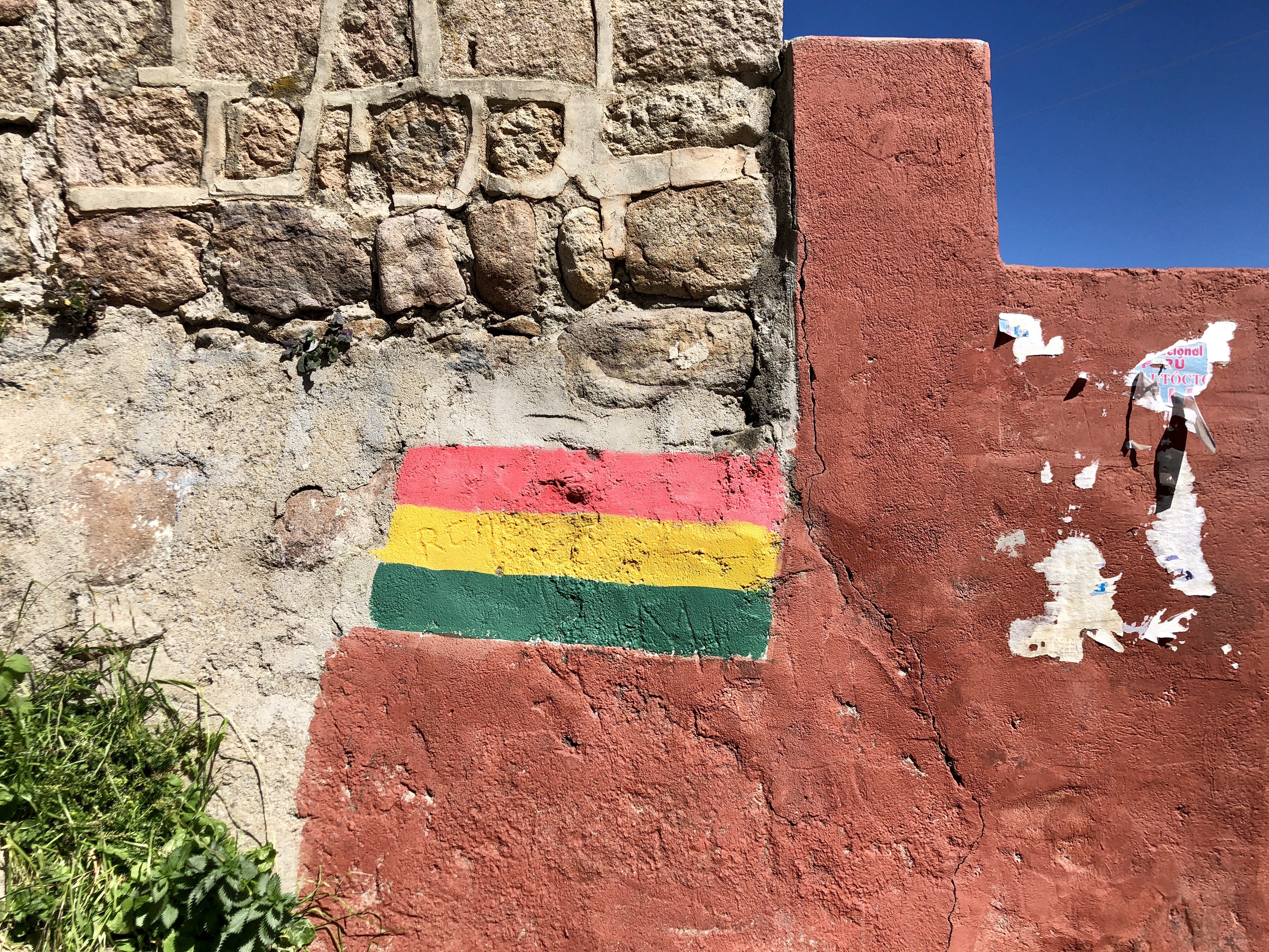 이렇게 두다리로 국경을 건너오면 담장에 볼리비아 국기가 새겨져 있습니다.