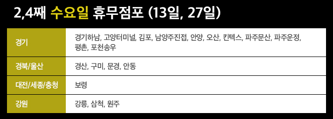• 11일, 25일 휴무 - 논산, 영주