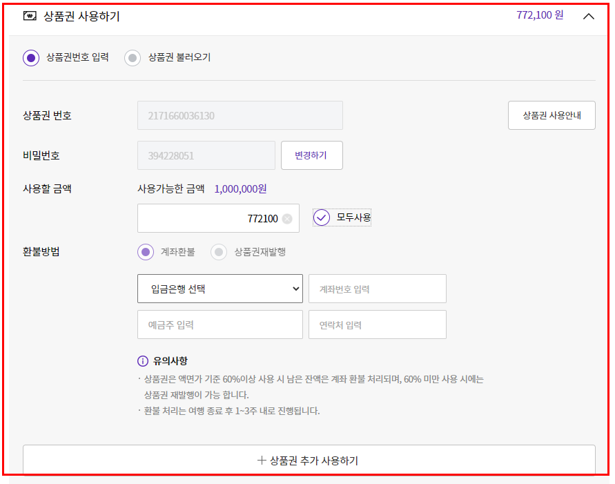 그럼 모두사용을 누르고 잔여 금액인 약 33만원은 계좌환불 받으면 됩니다.