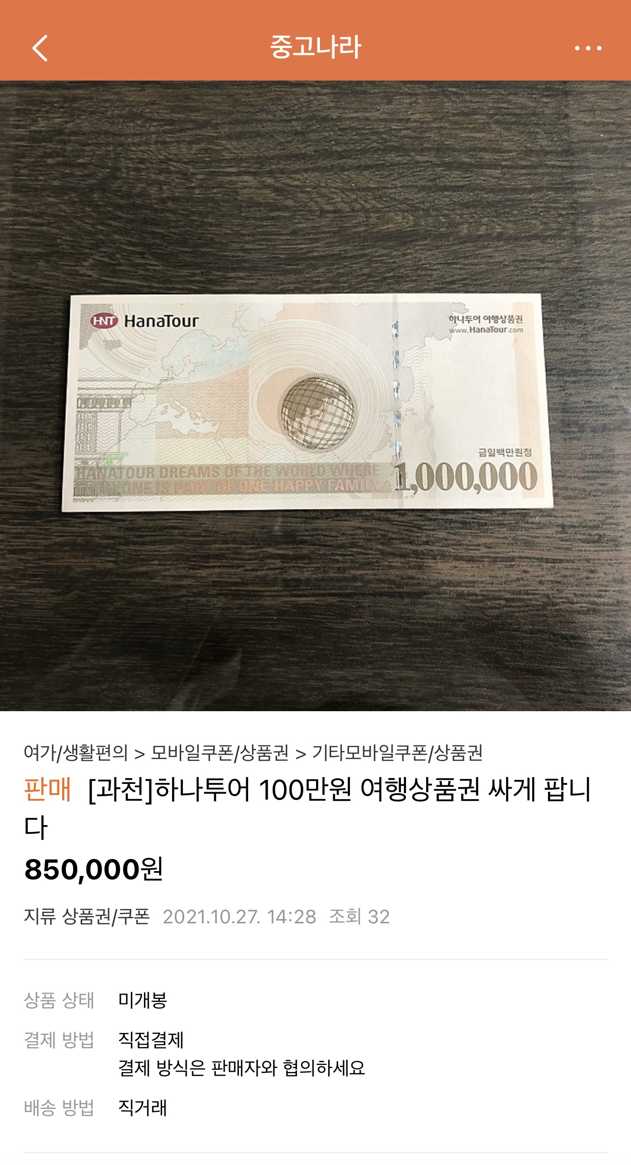 저는 중고나라를 통해서 하나투어 여행삼품권 100만원짜리를 85만원에 직거래로 구입하였습니다.