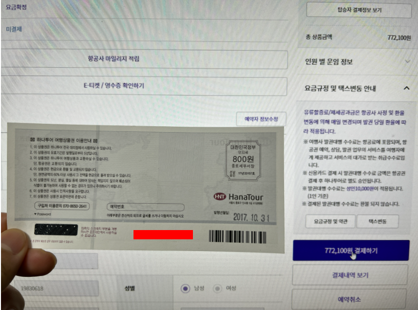 이 항공권을 국내 1등 여행업체인 하나투어를 이용해서 발권하게 되었습니다.